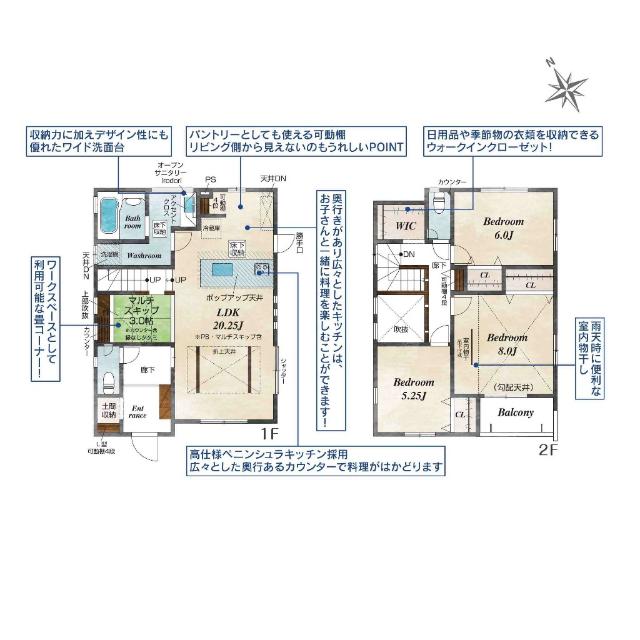 土間収納・室内物干し・ワイド洗面台・ペニンシュラキッチン等採用